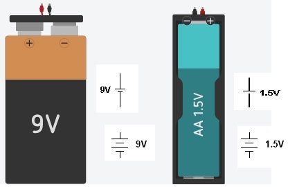 A tensão gerada na pilha e na bateria é dita constante ou contínua pois o seu valor não muda com o tempo, já a tensão da tomada é chamada de tensão alternada pois o seu valor se modifica com o tempo. No curso de corrente alterada você aprenderá melhor a diferença. A figura 1 mostra o aspecto físico e o símbolo de dois tipos de geradores conhecidos por você: Bateria e Pilha.