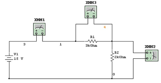 Seja um circuito série constituído por duas resistências em série, uma de 3 k (R1) e outra de 2 k (R2), alimentado por uma bateria de 15 V (V1).