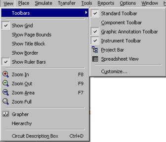 Colocar Componentes (Place Component), Mostrar Número dos Nós (Show Node Names), Colocar Texto (Place Text), Mostrar Grade (Show Grid), Mostrar Bordas (Show Border) e outros. Experimente.