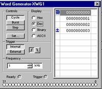 Como são duas as variáveis de entrada (B e A) as combinações possíveis são 4 (00,01,10,11), portanto a configuração do gerador de palavras deverá fornecer estas combinações. A figura20 mostra a configuração do gerador de palavras e do clock do analisador lógico.