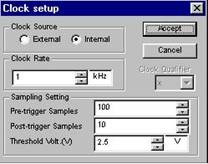 Clicando em Ajustar (Set), será aberta a janela de configuração da Figura 5. Nesta deve-se escolher entre relógio interno (Internal) ou externo (external), a freqüência do clock e a taxa de amostragem (Sampling setting). Aconselho a usar sempre o clock interno.