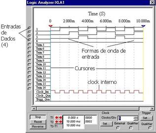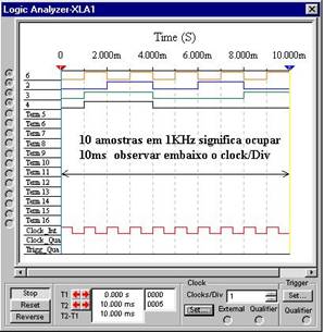 Na figura5 a taxa de amostragem pós gatilho é de 10, com um relógio de 1 kHz. A figura 6 mostra as formas de onda para esse ajuste.