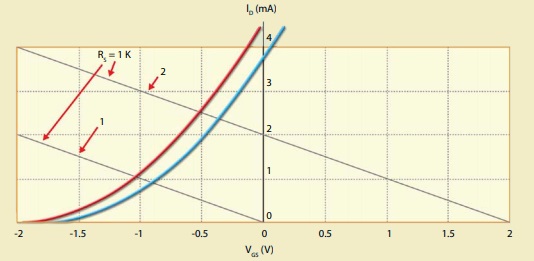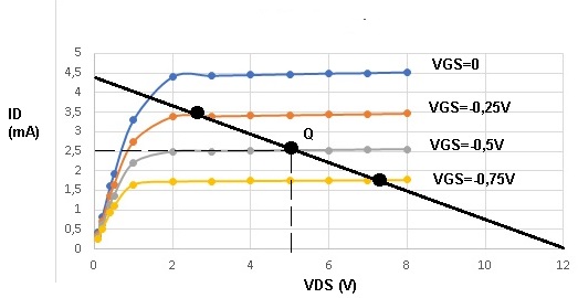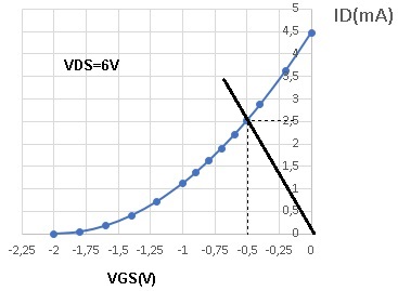 Para o ponto Q no circuito de autopolarização é melhor usar a curva de transferencia, IDxVGS. A intersecção dessa curva com a reta de carga de fonte determina o ponto Q. Como a corrente em RG é nula (a junção PN esta polarizada reversamente) então VGS= -Rs.ID. No circuito da Figura 2a Rs é calculado por: