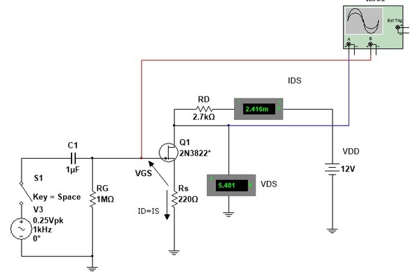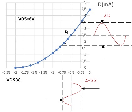 O ponto de polarização na Figura 2b é VGS=-0,5V e ID=2,5 mA. Apos a aplicação do sinal de 0,25Vp, a tensão na entrada varia de -0,25V a -0,75V resultando uma variação de corrente de dreno, a Figura 4 mostra isso.