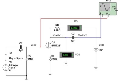 Figura 1a, basicamente é o mesmo visto na aula anterior, . Observe na Figura 1a que o sinal está desligado, portanto a tensão de dreno, VDS, a corrente de dreno, IDS, são valores CC, quiescentes e a tensão de porta é -0,5V. Na mesma Figura 1a os instrumentos marcam IDQ=2,52 mA e VDSQ= 5,2 V, são os valores quiescentes. A Figura 1b mostra o ponto quiescente na reta de carga