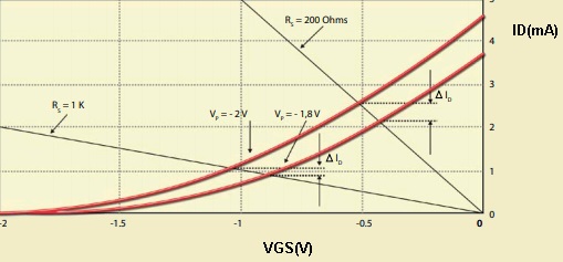 Um dos problemas que os transistores efeito de campo apresentam é a variação de parâmetros. Por exemplo, para um mesmo tipo de transistor, o valor de VP pode variar entre dois limites, alterando, consequentemente, o ponto de operação. A Figura 5 mostra o que acontece com o ponto Q quando consideramos duas curvas-limite, uma para um transistor com VP = –2 V e outra com VP = –1,8 V para dois valores de resistência de fonte: RS = 200 Ω e RS = 1000 Ω. Observe que, quanto maior o valor de RS, menor é a variação (ΔID), porém o ponto de operação se dará em uma região menos linear e de menor ganho.