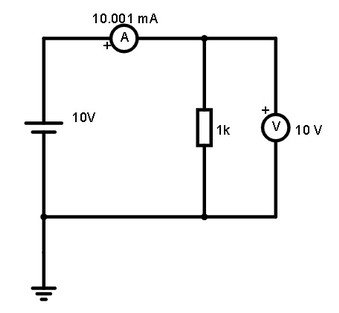 A seguir é mostrado passo a passo como construir um circuito simples (bateria+resistor+fios e terra) e simular. Como exemplo é mostrado um circuito com uma bateria de 10V e uma resistencia de 1k, o qual é bem conhecido. Na Figura 1 é mostrado o circuito já montado e a Figura 1b o mesmo circuito circuito com os valores de corrente. Monte o circuito nessa sequencia, mas pode ser em outra: