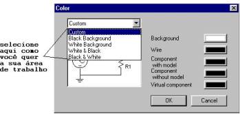 Por exemplo, para mudar a cor do fundo e dos componentes, clique com o botão direito na área de trabalho, selecione Cor (Color) se abrirá a caixa de seleção da figura3. Nesta caixa você poderá escolher a Cor do Fundo (background), Fio (wire) e de cor de Componentes (component). Experimente.