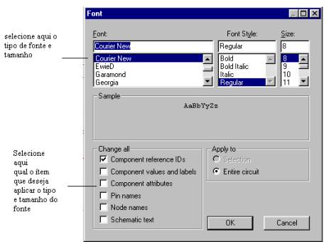 Clique com o botão direito na área de trabalho em Fonte (Font) aparecerá uma caixa de diálogo onde você poderá mudar o tamanho e o estilo da fonte de texto, identidade de componentes (Componente reference ID), rótulo (Component values and labels) e outros. Experimente.