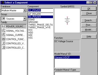 Figura 5 - Caixa de componentes Fontes (Sources) comFonte contnua (DC POWER) selecionada