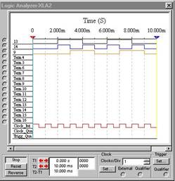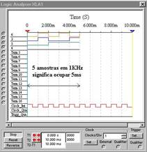 Na figura5 a taxa de amostragem pós gatilho é de 10, com um relógio de 1 kHz. A figura 6 mostra as formas de onda para esse ajuste.