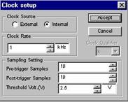 Clicando em Ajustar (Set), será aberta a janela de configuração da Figura 5. Nesta deve-se escolher entre relógio interno (Internal) ou externo (external), a freqüência do clock e a taxa de amostragem (Sampling setting). Aconselho a usar sempre o clock interno.