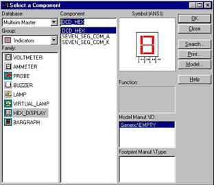 Existem dois tipos nde display: O display hexadecimal decodificado, que já tem incorporado um decodificador para sete segmentos, e o display de sete segmentos que necessita de um decodificador para poder funcionar, ambos estão na caixa Indicadores (Indicators).
