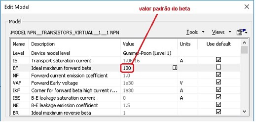Observe que o valor do beta do transistor é 100, ou b=IC/IB=5,599mA/55,99 mA = 100. Para ver o valor do beta, dar duplo clique no transitor, aparecer´á janela.