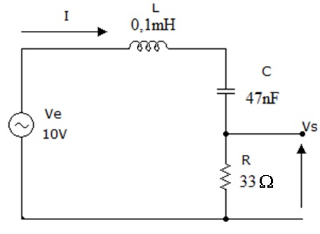3) Um circuito RLC serie é ligado a uma fonte senoidal de 10 V. Se R=50 Ohms, C= 10 nF e L=0,02 mH determinar: