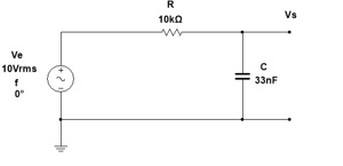 3) Um circuito RC série é conectado a uma fonte de 10V(RMS) e f=1 kHz. Se C=0,47 mF e R=1 k pedem-se: a) Valor de VC e VR b) Valor da corrente c) Se considerarmos o gerador como entrada, Ve, e a saída em C, Vs=VC, qual será o ganho em dB em 1 kHz? d) Qual a sua frequência de corte ?