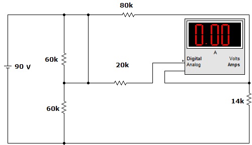 6) Para o circuito pedem-se:a) Resistencia equivalente que o gerador de 90 V "enxerga" b) Indicação do amperimetro (ideal)